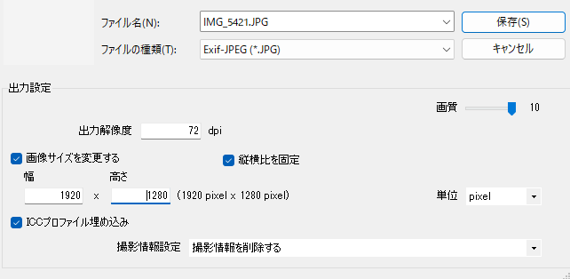 書き出す際に出力解像度は72dpi、画質は最高画質10にします。