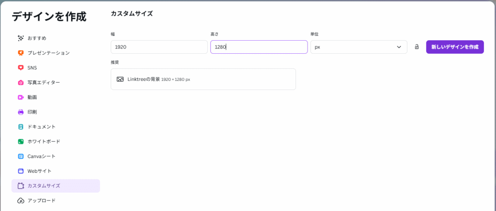 まず作成ボタンから、デザインを作成の中にある「カスタムサイズ」を選択し、画像のサイズに当てはめます。今回は1920px*1280pxの画像です。右側の「新しいデザインを作成」を押すと、そのサイズのキャンバスが作成されます。