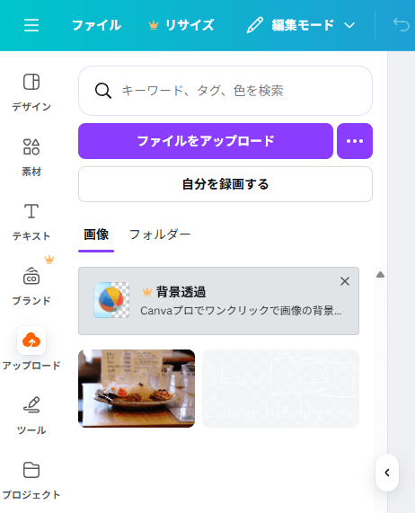 続いてメニューの「アップロード」から「ファイルをアップロード」を選択し、今回のカレーの画像とウォーターマークの画像をそれぞれアップロードします。