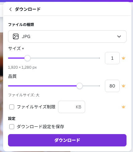 最後に右上の共有ボタンから「ダウンロード」を選択し、JPGでダウンロードします。右側に王冠のマークがついているのが有料版じゃないとできないところですね。