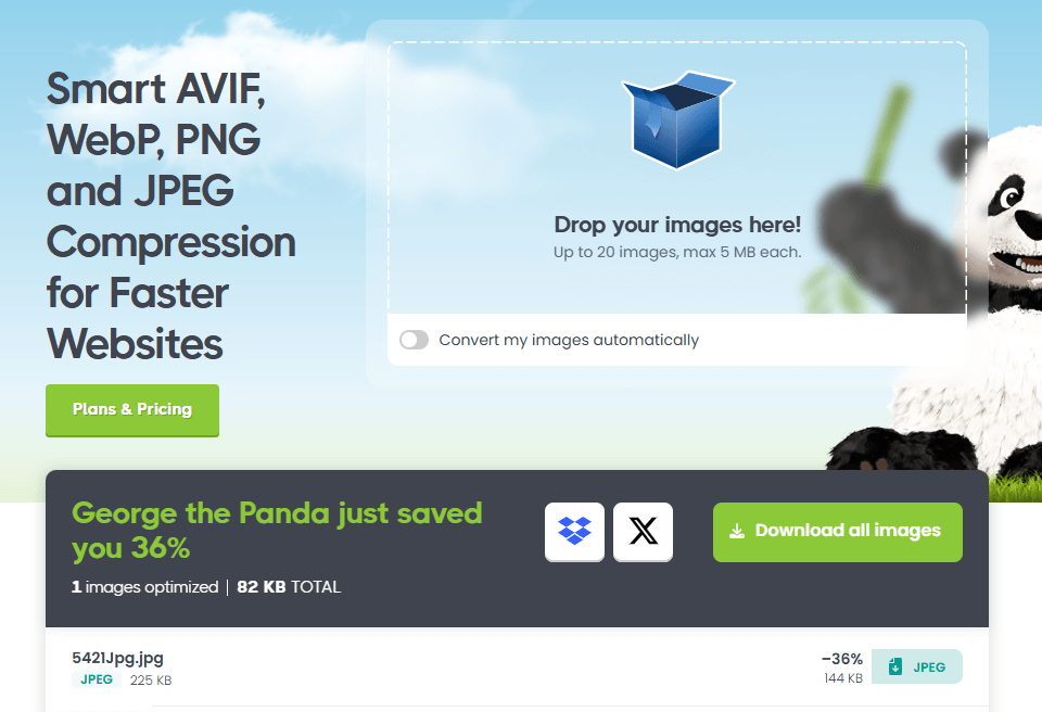 やり方もサイトの右上の「Drop your images here!」にドラッグ&ドロップして、しばらく待っていれば下に圧縮された画像が作られるのでそれを右下の「JPEG」と書かれたボタンを押してダウンロードするだけの簡単ステップで助かります。