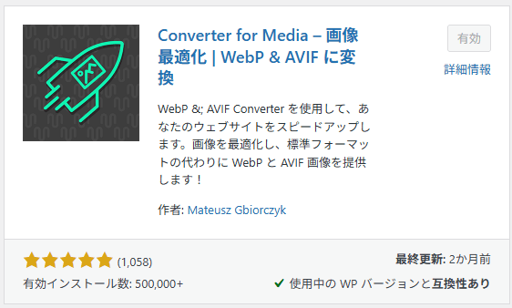 最終的にWordPressのブログサイトにメディアをアップするときに、JPEGやPNGを自動でWebP形式に変換して表示に使ってくれる「Converter for Media」というプラグインがあります。