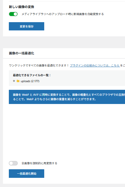 最初のタイミングで1回「画像の一括最適化」をしておくと、現在ブログにアップロードしている画像をすべてWebP形式に変えてくれます。